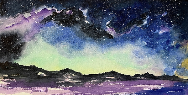 A vibrant night sky filled with stars stretches over a dark landscape, with swirling hues of purple, blue, and hints of green creating an ethereal... more